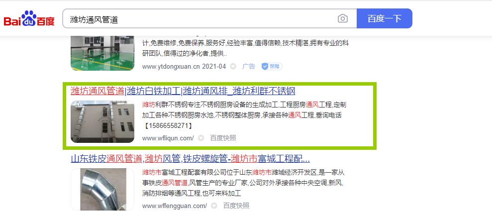 經(jīng)過三四年的網(wǎng)站運(yùn)行和維護(hù),該公司的相關(guān)關(guān)鍵詞排名理想,關(guān)鍵詞濰坊通風(fēng)管道、濰坊白鐵加工、濰坊不銹鋼廚具、濰坊不銹鋼廚房等關(guān)鍵詞排名穩(wěn)定,展現(xiàn)效果不錯。