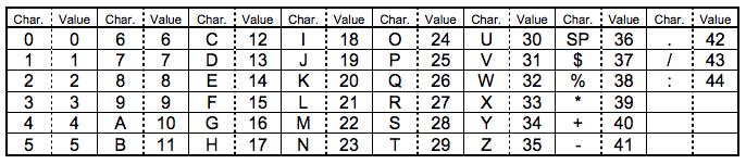 Alphanumeric mode 字符編碼。包括 0-9,大寫的A到Z(沒有小寫),以及符號(hào)$ % * + – . / : 包括空格。這些字符會(huì)映射成一個(gè)字符索引表。如下所示:(其中的SP是空格,Char是字符,Value是其索引值) 編碼的過程是把字符兩兩分組,然后轉(zhuǎn)成下表的45進(jìn)制,然后轉(zhuǎn)成11bits的二進(jìn)制,如果最后有一個(gè)落單的,那就轉(zhuǎn)成6bits的二進(jìn)制。而編碼模式和 字符的個(gè)數(shù)需要根據(jù)不同的Version尺寸編成9, 11或13個(gè)二進(jìn)制(如下表中Table 3)