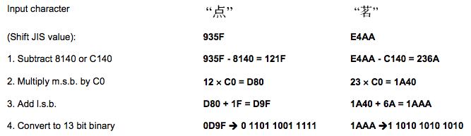 Kanji mode 這是日文編碼,也是雙字節(jié)編碼。同樣,也可以用于中文編碼。日文和漢字的編碼會(huì)減去一個(gè) 值。如:在0X8140 to 0X9FFC中的字符會(huì)減去8140,在0XE040到0XEBBF中的字符要減去0XC140,然后把前兩位拿出來乘以0XC0,然后再加上后兩位,最 后轉(zhuǎn)成13bit的編碼。如下圖示例: