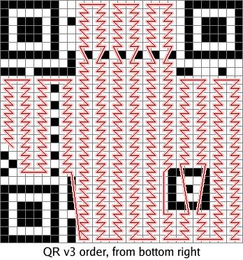 然后是填接我們的最終編碼,最終編碼的填充方式如下:從左下角開始沿著紅線填我們的各個(gè)bits,1是黑色,0是白色。如果遇到了上面的非數(shù)據(jù)區(qū),則繞開或跳過。