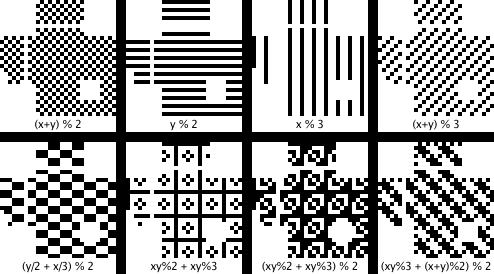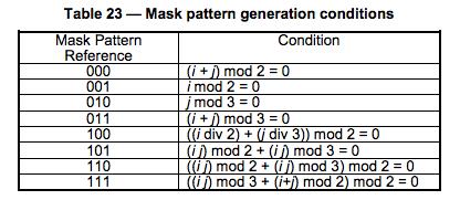這樣下來,我們的圖就填好了,但是,也許那些點(diǎn)并不均衡,所以,我們還要做Masking操作(靠,還嫌不復(fù)雜)QR的Spec中說了,QR有8個(gè) Mask你可以使用,如下所示:其中,各個(gè)mask的公式在各個(gè)圖下面。所謂mask,說白了,就是和上面生成的圖做XOR操作。Mask只會(huì)和數(shù)據(jù)區(qū)進(jìn) 行XOR,不會(huì)影響功能區(qū)。