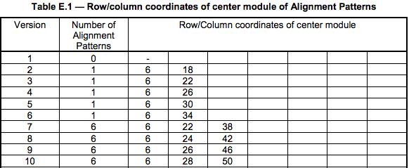 關(guān)于Alignment的位置,可以查看QR Code Spec的第81頁的Table-E.1的定義表(下表是不完全表格)