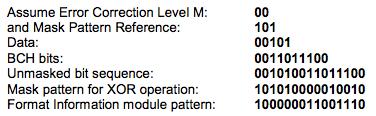 然后15個(gè)bits還要與101010000010010做XOR操作。這樣就保證不會(huì)因?yàn)槲覀冞x用了00的糾錯(cuò)級(jí)別,以及000的Mask,從重造成全部為白色,這會(huì)增加我們的掃描器的圖像識(shí)別的困難。