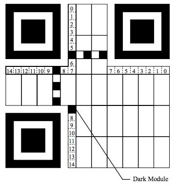 Format Information是一個(gè)15個(gè)bits的信息,每一個(gè)bit的位置如下圖所示:(注意圖中的Dark Module,那是永遠(yuǎn)出現(xiàn)的)