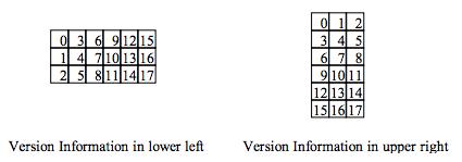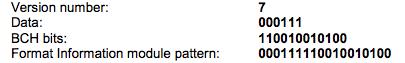 Version Information一共是18個(gè)bits,其中包括6個(gè)bits的版本號(hào)以及12個(gè)bits的糾錯(cuò)碼,下面是一個(gè)示例: