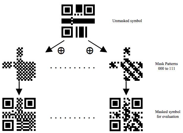 這樣下來,我們的圖就填好了,但是,也許那些點(diǎn)并不均衡,所以,我們還要做Masking操作(靠,還嫌不復(fù)雜)QR的Spec中說了,QR有8個(gè) Mask你可以使用,如下所示:其中,各個(gè)mask的公式在各個(gè)圖下面。所謂mask,說白了,就是和上面生成的圖做XOR操作。Mask只會(huì)和數(shù)據(jù)區(qū)進(jìn) 行XOR,不會(huì)影響功能區(qū)。